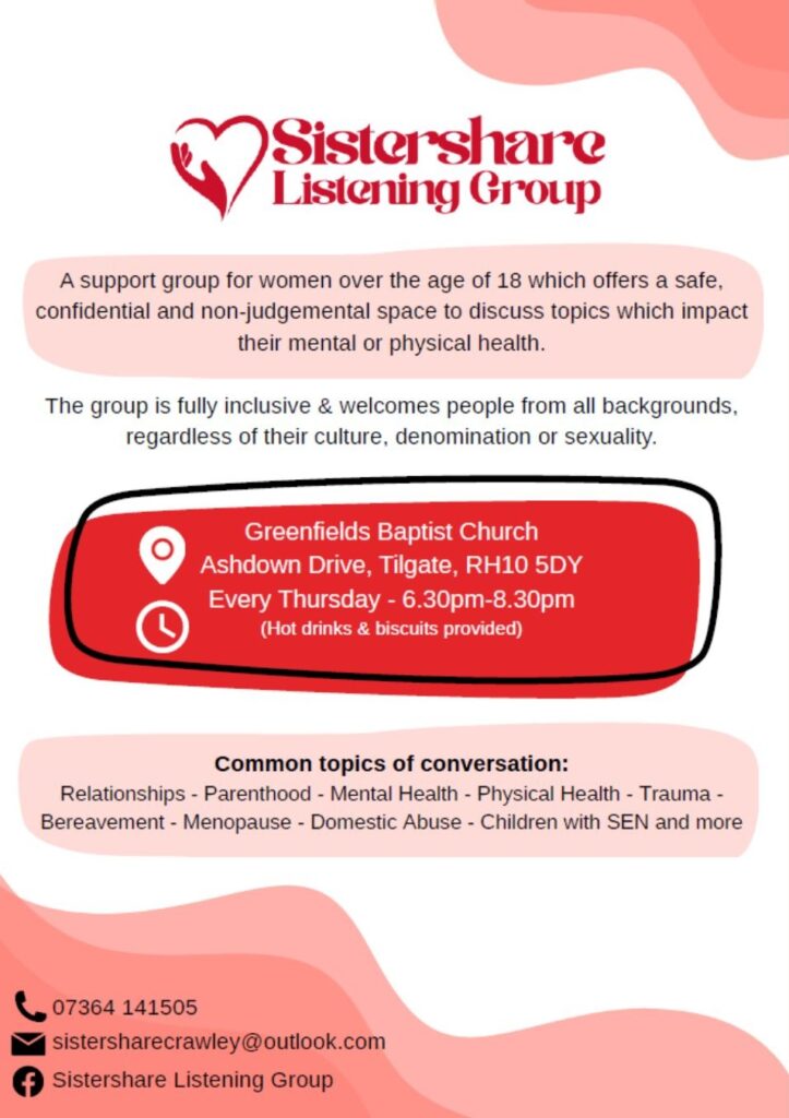 Sistershare Listening Group is a women’s support group based in Crawley, West Sussex, operating on Thursday evenings. The group provides a safe, confidential, and non-judgemental space for women aged 18 and over to discuss topics that impact their physical and mental health.